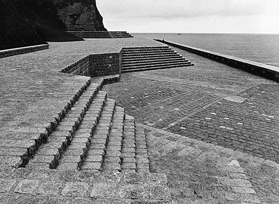 Peña Ganchegui crea una antesala al mar con una serie de plataformas de adoquines que se abren a la bahía de la Concha. El Peine del Viento de Chillida acentúa el carácter contemplativo y trascendente del conjunto.